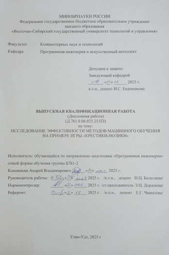 Исследование эффективности методов машинного обучения на примере игры "крестики-нолики" : ВКР бакалавра : направление подготовки 09.03.04 "Программная инженерия"