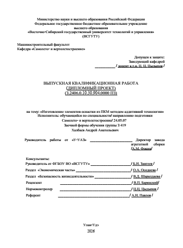 Одной из актуальных проблем современного производства является длительный и трудоемкий процесс подготовки производства, а именно проектирование и изготовление оснастки. Тема дипломного проекта обосновывается необходимостью сокращения сроков изготовления оснастки для формообразования деталей из полимерно-композитных материалов (ПКМ) и снижения стоимости ее изготовления. В настоящее время на предприятии АО «Улан-Удэнский Авиационный Завод» вся оснастка изготавливается из металлов и металлических сплавов. При изготовлении крупногабаритных изделий из полимерных композиционных материалов (ПКМ) в специальных технологических процессах, применение обычных металлических форм становится нерентабельным вследствие большой металлоѐмкости, высокой трудоѐмкости изготовления (слесарной и механической обработки) и энергоѐмкости процесса. Детали и агрегаты из ПКМ производятся из стеклоткани и препрегов с использованием ручного метода формования.