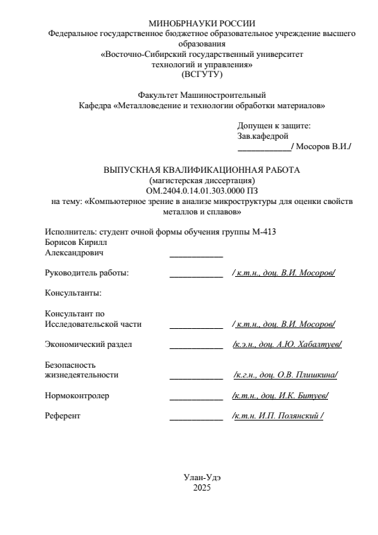 Современное промышленное производство требует постоянного совершенствования технологий и методов контроля качества материалов, используемых в производстве. Одним из ключевых показателей качества металлических изделий является структура зерен, поскольку она напрямую влияет на механические свойства металла, такие как прочность, пластичность и устойчивость к коррозии. Определение балла зерна сталей и сплавов в соответствии ГОСТ - 5639-82, а также определение толщины слоя цементации является важной задачей контроля качества на предприятиях. В основном балл зерна сталей и сплавов эксперты определяют «на глаз», что может приводить к различной оценке результатов, поэтому определение балла зерна металлов и сплавов методом компьютерного зрения необходимо для точности полученных данных.
