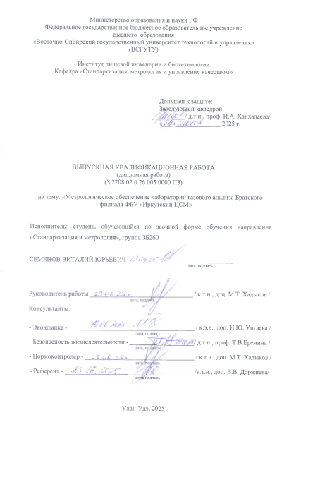 В современных условиях развития промышленности и технологий особую значимость приобретает обеспечение единства измерений, особенно в области газового анализа. Газоанализаторы широко применяются в различных отраслях, включая энергетику, нефтехимию, металлургию и экологический мониторинг, что делает их поверку и метрологическое обеспечение критически важными для безопасности и эффективности производственных процессов. Целью данной выпускной квалификационной работы является анализ метрологического обеспечения лаборатории газового анализа Братского филиала ФБУ «Иркутский ЦСМ», включая оценку оснащенности, процедуры поверки, а также рассмотрение процесса расширения области аккредитации для включения новых видов измерений.