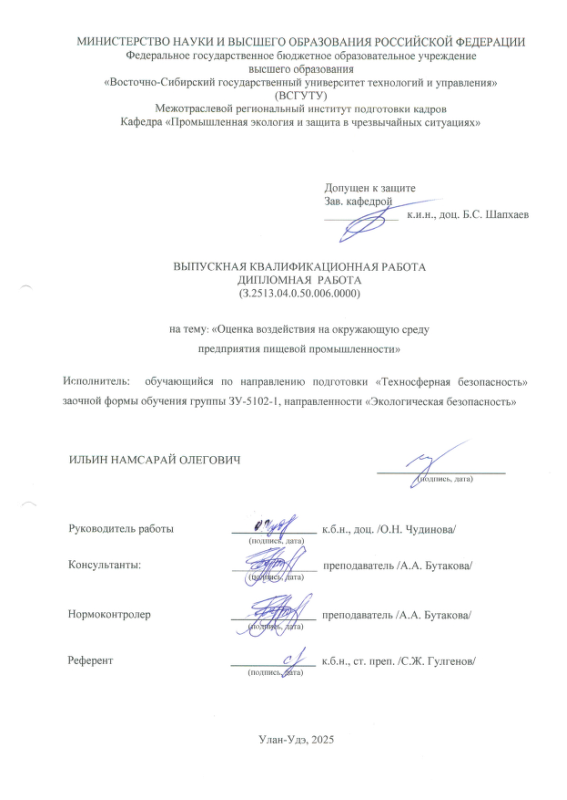 Оценка воздействия на окружающую среду предприятий пищевой промышленности : ВКР бакалавра : направление подготовки 20.03.01 "Техносферная безопасность"