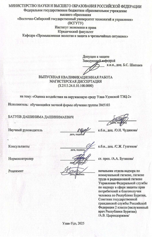 Оценка взаимодействия на окружающую среду Улан-Удэнской ТЭЦ-2 : ВКР магистра : направление подготовки 20.04.01 "Техносферная безопасность"
