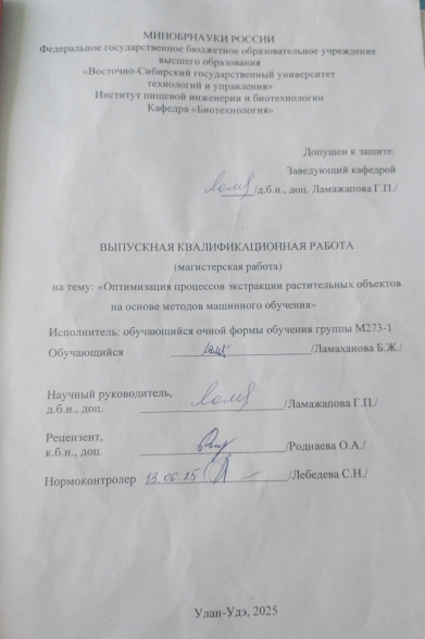 Оптимизация процессов экстракции растительных объектов на основе методов машинного обучения : ВКР магистра : направление подготовки 19.04.01 "Биотехнология"