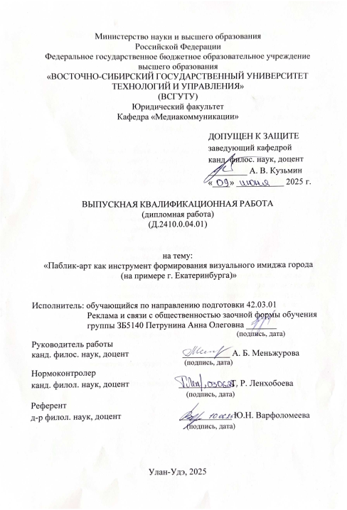 Паблик-арт как инструмент формирования визуального имиджма города (на примере г. Екатеринбурга) : ВКР бакалавра : направление подготовки 42.03.01 "Реклама и связи с общественностью"