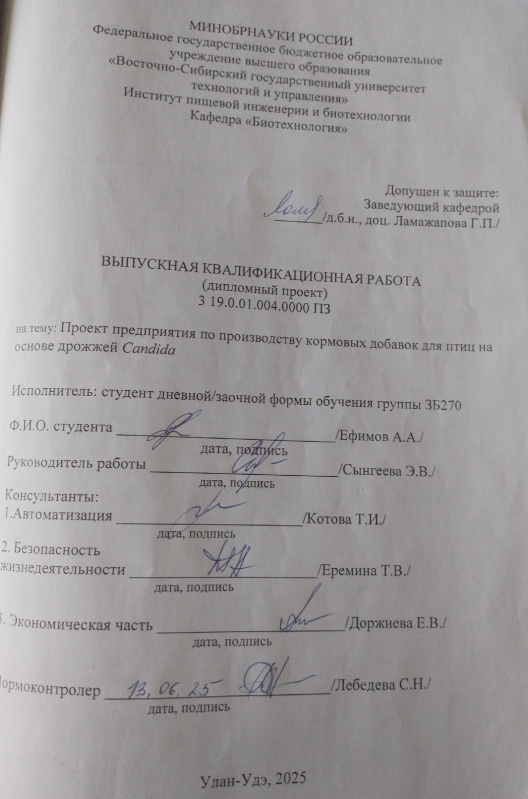 Проект предприятия по производству кормовых добавок для птиц на основе дрожжей Candida : ВКР бакалавра : направление подготовки 19.03.01 "Биотехнология"