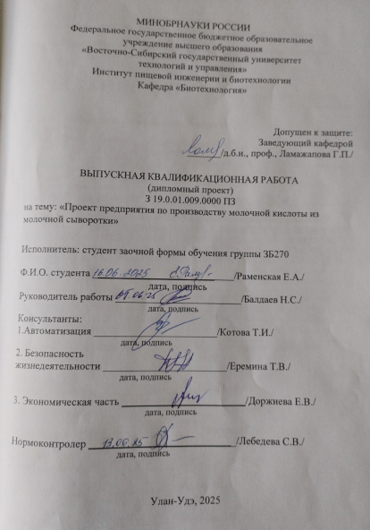 Проект предприятия по производству молочной кислоты из молочной сыворотки : ВКР бакалавра : направление подготовки 19.03.01 "Биотехнология"