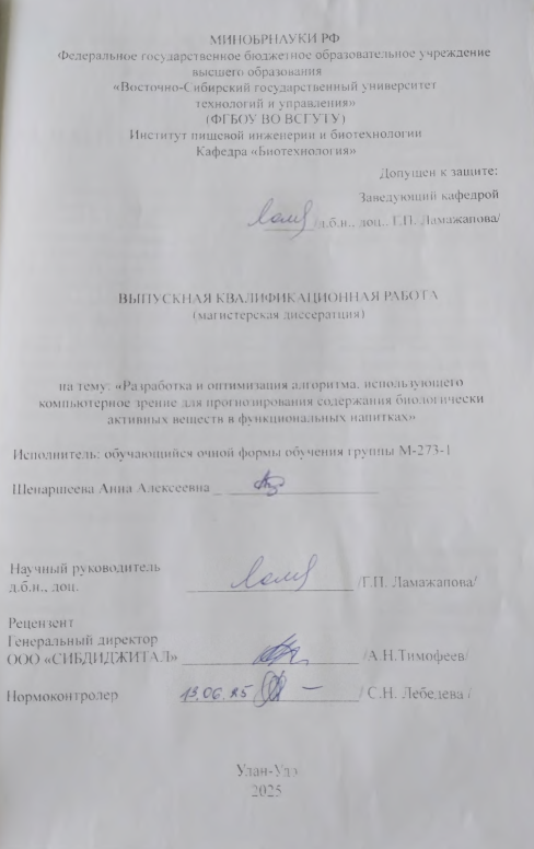 Разработка и оптимизация алгоритма, использующего компьютерное зрение, для прогнозирования содержания биологически активных веществ в функциональных напитках : ВКР магистра : направление подготовки 19.04.01 "Биотехнология"