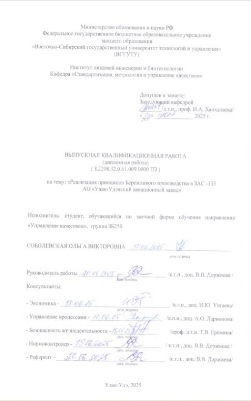 Реализация принципов бережливого производства на ЗАС-133 АО "Улан-Удэнский авиационный завод" : ВКР бакалавра : направление подготовки 27.03.02 "Управление качеством"