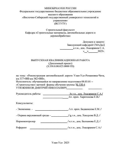 Участок автомобильной дороги Улан-Удэ- Романовка-Чита км 357+000 – км 362+000, протяженностью 5,0 км, подлежащий реконструкции, расположен в Еравнинском районе Республики Бурятия. Еравнинский район расположен в Северо-Восточной части республики. В данном проекте представлены результаты исследования характеристик района строительства, технические нормативы участка строительства; строительные решения земляного полотна, дорожной одежды, водоотвода и искусственных сооружений; технология и организация строительства, обустройства и безопасность движения; сравнение вариантов дорожной одежды; разработка графической части при реконструкции дороги. В результате реконструкции существующей автомобильной дороги было повышено транспортно-эксплуатационные показатели.