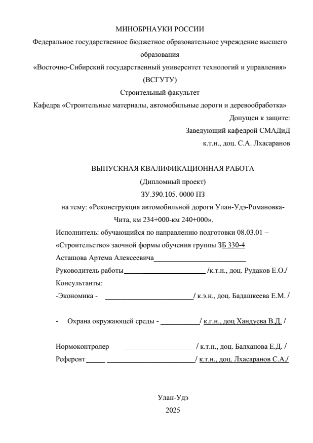 Участок автомобильной дороги Улан-Удэ- Романовка-Чита км 234+000 – км 240+000, протяженностью 6,0 км, подлежащий реконструкции, расположен в Еравнинском районе Республики Бурятия. Еравнинский район расположен в Северо-Восточной части республики. В данном проекте представлены результаты исследования характеристик района строительства, технические нормативы участка строительства; строительные решения земляного полотна, дорожной одежды, водоотвода и искусственных сооружений; технология и организация строительства, обустройства и безопасность движения; сравнение вариантов дорожной одежды; разработка графической части при реконструкции дороги. В результате реконструкции существующей автомобильной дороги было повышено транспортно- эксплуатационные показатели.