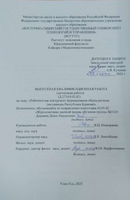 В современном информационном обществе средства массовой информации играют ключевую роль в формировании имиджа территорий: стран и их регионов. Одним из инструментов, обеспечивающих значительность этой роли, являются рейтинги регионов. Они не только отражают состояние социально-экономического развития субъектов Российской Федерации, но и во многом формируют жизненные предпочтения их населения, определяя во многом характер региональной идентичности. Региональные рейтинги СМИ, таким образом, становятся важным инструментом для принятия решений органов власти, инвесторов, представителей бизнеса, а также для жителей региона в формировании их жизненных предпочтений, целей и стратегий их достижения. Учитывая влияние региональных рейтингов на формирование образа российских регионов, полагаем настоящее исследование образа Республики Бурятия в контексте рейтинговых медиапродуктов актуальной темой выпускной квалификационной работы по направлению подготовки 42.03.02 «Журналистика».