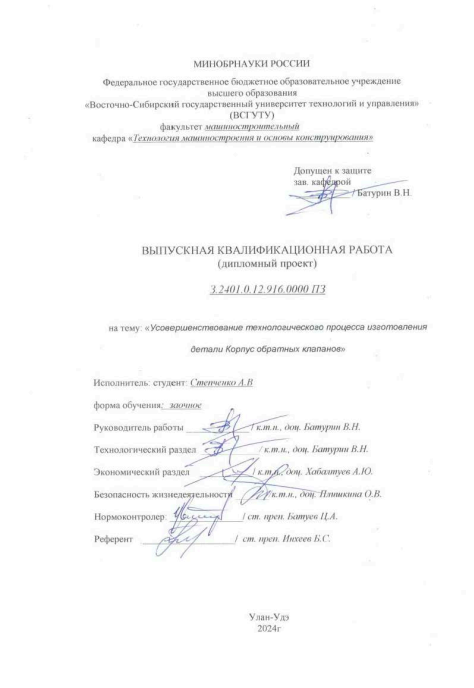 В представленном дипломном проекте разрабатывается технологический процесс механической обработки детали «Корпус обратных клапанов» с использованием фрезерного обрабатывающего центра СИГАС ГС500. При изготовлении детали возникают определенные проблемы. Так как заготовкой является отливка, могут возникать скрытые дефекты в виде раковин, трещин, которые выявляются в процессе механической обработки. Приходится учитывать то что обработать все конструктивные элементы и поверхности за минимальное количество установок на устаревшем оборудовании невозможно. Дипломный проект представляет собой расчетно-графическую работу, в которой обобщаются все технологические познания и навыки, приобретенные за время обучения. Дипломный проект является большой самостоятельной работой будущего технолога, направленной на решение конкретных задач в области совершенствования технологии, организации производства и улучшение технико-экономических показателей работы участка. Наряду с этим дипломное проектирование закрепляет умение студента пользоваться справочной литературой, ГОСТами, таблицами, номограммами, нормами и расценками умело, сочетая справочные данные с теоретическими знаниями, полученными в процессе изучения курса.