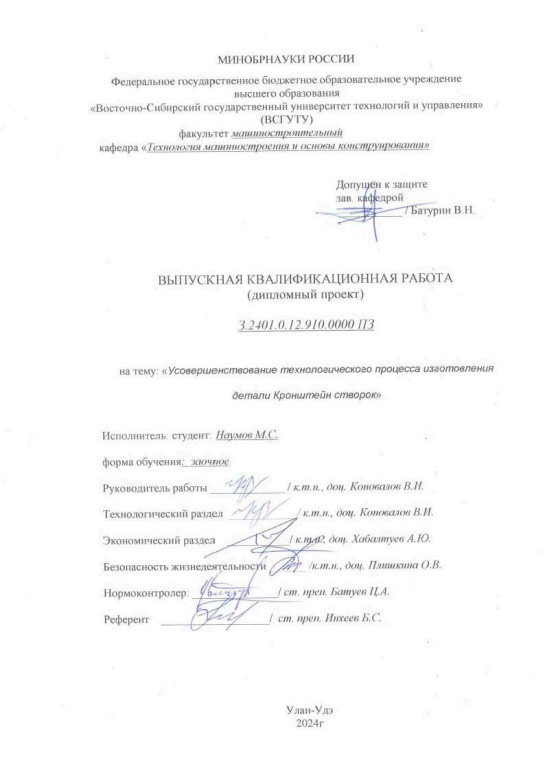 Усовершенствование технологического процесса изготовления детали Кронштейн створок : ВКР бакалавра : направление подготовки 15.03.05 "Конструкторско-технологическое обеспечение машиностроительных производств"