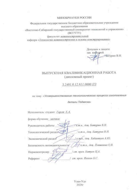 Усовершенствование технологического процесса изготовления детали Подвеска : ВКР бакалавра : направление подготовки 15.03.05 "Конструкторско-технологическое обеспечение машиностроительных производств"