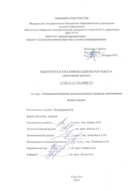 В дипломном проекте разрабатывается технологический процесс механической обработки детали «Вилка». Целью разработки является снижение временных затрат обработки детали по сравнению с базовым технологическим процессом, а также улучшение технико-экономических показателей и показателей эффективности. Задачей ставится усовершенствование технологического процесса изготовления детали «Вилка», внедрение в технологию станков с числовым программным управлением. Данный проект содержит спроектированный вариант технологического процесса на изготовление детали «Вилка». Поверхности детали (по базовому варианту технологического процесса) обрабатываются на универсальных станках и на устаревшем оборудовании, оснащенном системами числового программного управления. Анализ базового варианта технологического процесса позволил выявить решаемую проблему - значительное время изготовления детали, то есть целью проекта является: сокращение основного и штучного времени на изготовление детали.